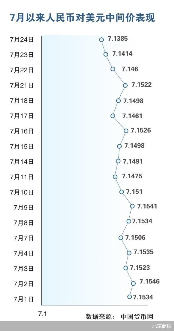 7月24日,中国人民银行授权中国外汇交易中心公布,当日银行间外汇市场人民币汇率中间价为1美元对人民币7.1385元,相较前一交易日中间价7.1414元调升29个基点。人民币对美元中间价连续三个交易日升值,续创2024年11月以来高点。